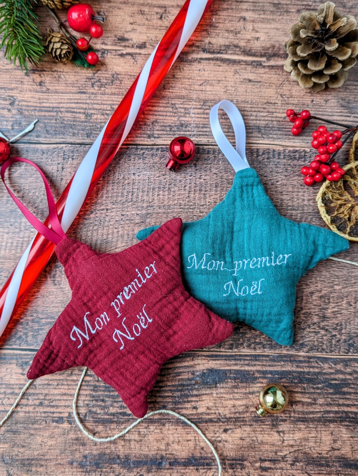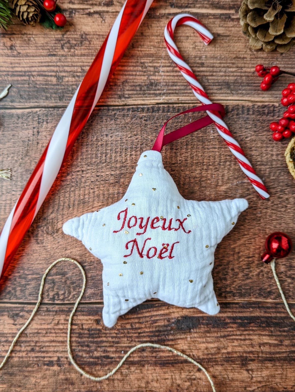 Possibilité de broder les textes suivants : « Mon premier Noël, Joyeux Noël, Merry Christmas, prénom ou surnom de bébé, Papa, Maman, Mamie, Papy… laissez parler votre imagination.